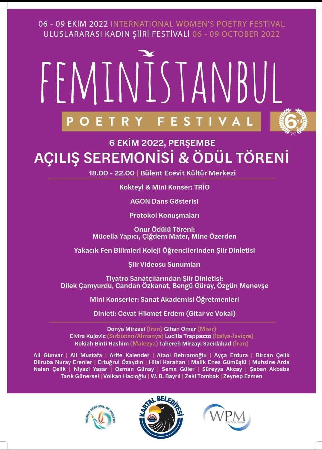 UNESCO’ya bağlı Uluslararası Şiir Organizasyonları içinde yer alan, “FeminİSTANBUL Kadın Şiiri Festivali” bu yıl altıncı kez, 6-9 Ekim 2022’de, Kartal Belediyesi’nin desteğiyle düzenlenecek. “Küresel Krize Karşı Küresel Şiir” manifestosuyla yola çıkan FeminİSTANBUL, kadınlığın sorunlarına dair evrensel bir fikir, sanat ve diyalog platformu olma hedefini sürdürüyor.